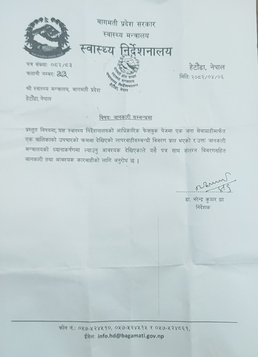 घटनाको बारेमा स्वास्थ्य निर्देशनालयमा उजुरी परेपछि स्वास्थ्य निर्देशनालयले स्वास्थ्य मन्त्रालयलाई पत्र पठाएको थियो। सोही पत्रको आधारमा स्वास्थ्य मन्त्रालयले छानबिन समिति गठनगरी छानबिन गर्ने निर्णय गरेको थियो।