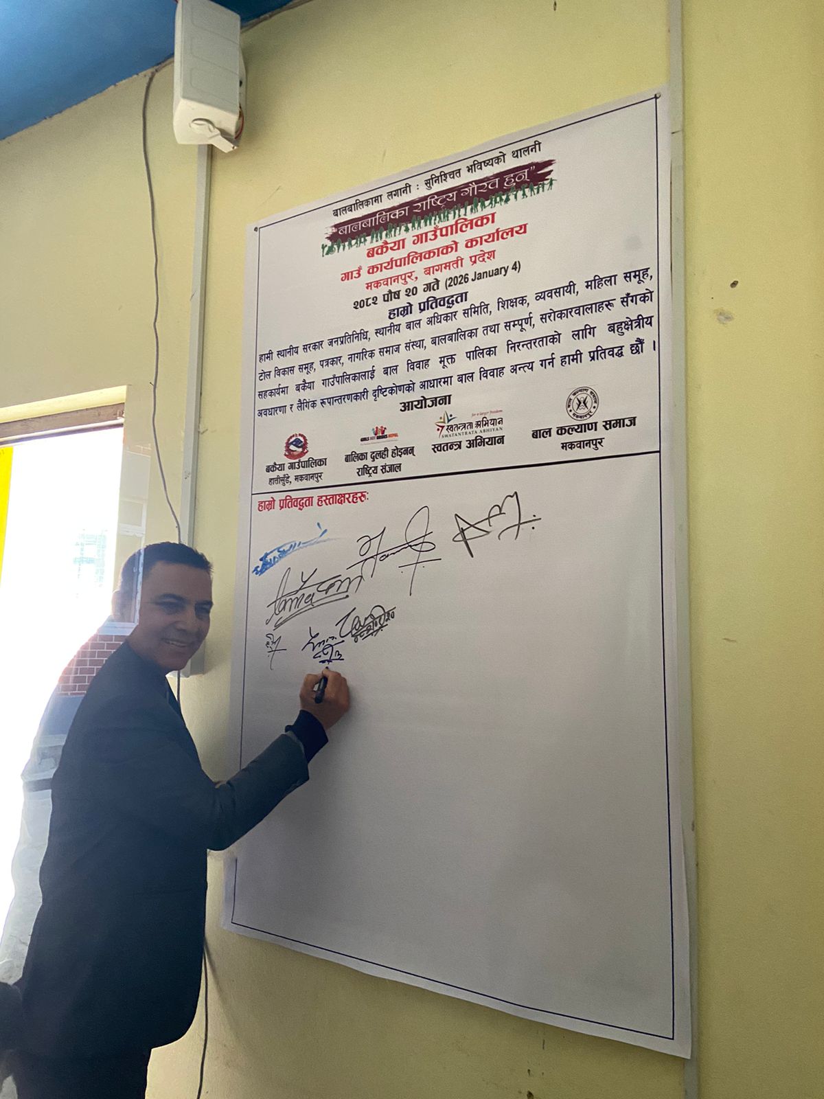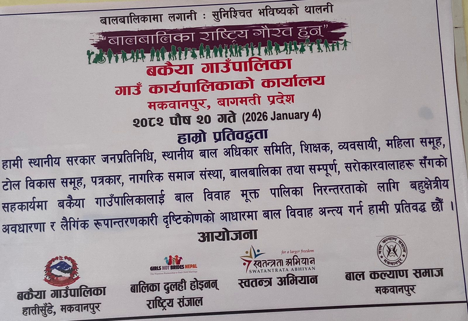 उक्त कार्यक्रम बकैया गाउँपालिका, बालिका दुलही होइनन् राष्ट्रिय सञ्जाल नेपाल (GNB नेपाल), स्वतन्त्रता अभियान नेपाल र बाल कल्याण समाज मकवानपुरको संयुक्त आयोजनामा सम्पन्न भएको हो। कार्यक्रममा बालविवाह, उमेर नपुगी हुने विवाह तथा जबर्जस्ती विवाहविरुद्ध हस्ताक्षर गर्दै सामूहिक प्रतिबद्धता व्यक्त गरिएको थियो।